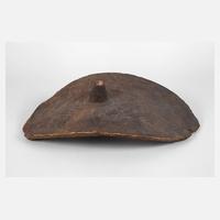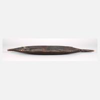 Papua-Neuguinea, 1. Hälfte 20. Jh., große ovale Form, schwarz eingefärbt mit Resten alter Farbfassung, gewölbte Seite, verziert mit einfachen Schnitzarbeiten, beidseitig mit profiliert gearbeiteten Griffen, leichte Krustierung, allgemein gute Erhaltung, L 99 cm.