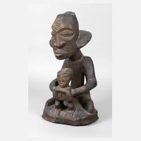 Angola/Zaire, 20. Jh., den Chokwe zugeschrieben, hartes Tropenholz, dunkel eingefärbt und beschnitzt, vollplastische Darstellung eines knienden Mannes mit davor stehendem Kind, beide mit vielen Tatauierungen, um den Kopf des Mannes verläuft eine breite Halskrause, H 50 cm.
