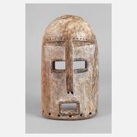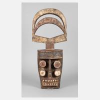 der Gurunsi, Nuna, Numuna, Fra oder Winiana aus dem südlichen Burkina Faso oder Ghana, weiches Tropenholz, rotbraun krustiert und weiß abgesetzt, Maske mit vier Augenschlitzen und Haltegriff aus verdrehten Antilopengehörn, der Brettaufsatz reich ornamental verziert, diese Masken sind in vielfältigen Ausführungen und Formen in den Stammesgebieten verbreitet, vorwiegend nicht tragbar, geringer, wohl inaktiver Anobienbefall, H ca. 120 cm.