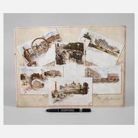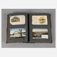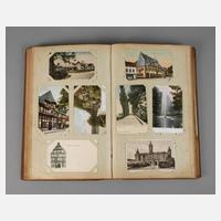 um 1910, ca. 150 Stück, meist topographische Motive, Gruss aus ...: Duisburg, Karlsbad, Schwarzenberg Erz., Kaiserwerth, Mainz, Hannover, Rüdesheim, Wiesbaden, dem fürstlichen Kurhaus, Restaurant zu Bad Pyrmont, dem Zoologischen Garten in Köln, Salzungen, von der Georgshöhe, vom Hexentanzplatz, vom Feldberg, Reichenhall, Oslebshausen b. Bremen, dem Bergischen Lande, Schlangenbad, der Flora in Köln, Magdeburg, Waldsassen, Plön, vom Rhein, dem Union-Restaurant Oldenburg, Norderney, München, Karlsruhe, Rothenburg o.T., Karlsruhe, Wesel, Chemnitz, Mühlhausen i. E., Ulm, vom Titisee, Heidelberg, Liebenzell, vom Belchen, Stuttgart, der Kaiserstadt Berlin, wenige Postkarten um 1930, teilweise farbig lithogr., schöne reliefgeprägte Karte Völkerschlacht-Nationaldenkmal bei Leipzig, im Jugendstilalbum mit floralem Deckelmotiv, selbst gestaltetes Frontispiz, normale Altersspuren, Maße Album ca. 37 x 22,5 cm.