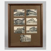 1. Hälfte 20. Jh., sieben Postkarten mit monumentalen Gebäuden aus Daressalam in Tansania, hinter Glas gerahmt, altersgemäßer Zustand, Maße Rahmen ca. 55,5 x 44 cm.