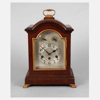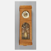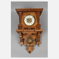 um 1910, auf Werkplatine gemarkt, Gehäuse in Eiche, braun gebeizt, die Messingapplikationen später goldbronziert, Werk mit drei Aufzügen und Viertelstundenschlag auf fünf Tonstäbe mit Spielwerk (Westminsterschlag), funktionstüchtig, mit Schlüssel, Maße 40 x 21 x 31 cm.