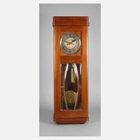 auf Gong gemarkt FMS Friedrich Mauthe Schwenningen, um 1910, Gehäuse aus Eiche rotbraun gebeizt, mit geometrischer Intarsie und feiner Schnitzerei verziert, Ziffernblatt, Gewichte und Pendel mit floralem Ätzdekor, zwei Gewichte, Halbstundenschlag auf Tonfeder, eine Kette fehlt, facettgeschliffene Glasscheiben, Maße 205 x 60 x 33 cm.