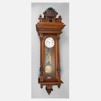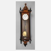 um 1900, Werk rückseitig mit Flügelradmarke, Patent 1 Million, Werk mit Halbstundenschlag auf Tonfeder, emaillierter Ziffernring mit arabischen Zahlen, reich verzierte Pendellinse Damenportrait, Nussbaumgehäuse, funktionstüchtig mit Schlüssel, Bekrönung fehlt, H 66 cm.