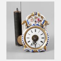 Schwarzwald, um 1860, reliefiertes Porzellanschild mit feiner floraler Bemalung und Vergoldung, Emailziffernblatt, Weckscheibe aus Messing, Schlag auf Glocke, nur eine Kette und ein Gewicht vorhanden, Gehwerk läuft, H 11,5 cm.