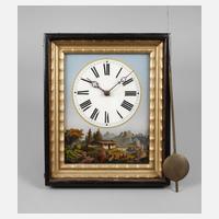 2. Hälfte 19. Jh., mit lithografiertem Hinterglasbild mit Alm am Gebirgssee, Vergoldung erneuert, Glas und Gewicht fehlen, H 31 x B 26 x T 14 cm.