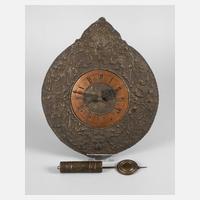 gemarkt J. Jageman, Kunstgewerbliche Werkstätten für Uhren München, um 1900, im Renaissancestil gestaltete Front aus getriebenem Messingblech patiniert, Ziffernring aus Kupfer mit Ätzdekor, einfaches Holzplatinenwerk ohne Schlag, funktionstüchtig, H 38 cm.