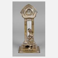 um 1910, am Boden gemarkt, Messing versilbert, in Form einer Standuhr, welche von einem jungen Mädchen aufgezogen wird, mit verspiegelter Scheibe, Uhrwerk gemarkt Junghans, funktionstüchtig, H 42 cm.