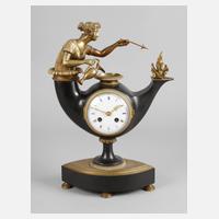 in Form einer Öllampe, Frankreich, 1. Hälfte 19. Jh., Bronze vergoldet und schwarz patiniert, mehrteilig gegossen und verschraubt, rundes Messingplatinenwerk, mit oben liegendem Echappement, Halbstundenschlag auf Glocke, Front mit makellosem Emailziffernblatt, römischen Ziffern und fein ausgesägten vergoldeten Originalzeigern, funktionstüchtig, guter Originalzustand, H 39,5 cm.
