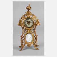 deutsch, um 1890, durchbrochen gearbeitetes Gehäuse aus vergoldetem Messing, mit Einlage aus Biskuitporzellan, einfaches Gehwerk, Emailziffernblatt beschädigt, Werk läuft, H 26 cm.