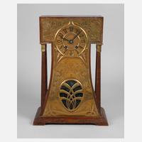 deutsch, um 1900, auf Werkplatine gemarkt Lenzkirch AGU 1 Million, Werknummer 423931, rückseitig Verkäuferetikett G. Witschel Görlitz, Gehäuse aus Eiche braun gebeizt, verziert mit dekorativem Messingbeschlag, teils getrieben sowie geätzt und mit grünlich marmoriertem Glas hinterlegt, Silberdisteldekor, Halbstundenschlag auf Tonspirale, funktionstüchtig, Bekrönung fehlt, H 45 cm.