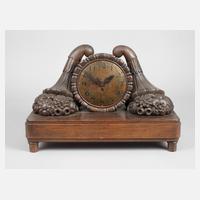deutsch, um 1915, Eiche massiv, braun gebeizt, Gehäuse mit zwei Füllhörnern verziert, Ziffernblatt aus Messing getrieben, Uhrwerk ohne Schlag, funktionstüchtig, Bekrönung fehlt, H 30 x B 42 x T 20 cm.