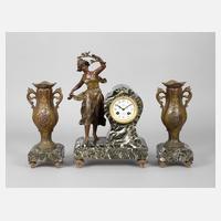 Frankreich, um 1900, Metallguss, mehrfarbig patiniert, Pendulenwerk gemarkt FC, mit Halbstundenschlag auf Glocke, dazu zwei Beisteller in Vasenform, funktionstüchtig, ohne Schlüssel, H 42 cm.