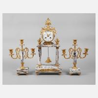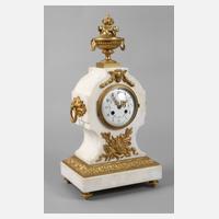 Werk gemarkt F. Martin, Paris, um 1900, violett-grau geädertes Marmorgehäuse, Applikationen aus vergoldeter Bronze, Pendulenwerk mit Halbstundenschlag auf Glocke, feines farbiges Emailziffernblatt mit winzigem Chip am Rand, Werk läuft, mit Schlüssel, H 50 cm.