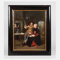 Prägemarke, Jahreszeichen H, 1908, geritzte Nummer 1842 - 13 1/2, signiert E. Scherf, große Porzellanbildplatte mit allerfeinster Bemalung, Selbstportrait des Künstlers mit seiner Frau Isabella de Wolff in einer Taverne, in einer schwarzen Lackleiste mit goldreliefiertem Innenrand gerahmt, dieser etwas restaurierungsbedürftig, Platte in sehr gutem Zustand, Maße Platte 51,5 x 42,5 cm, Gesamtmaß 62 x 53 cm.