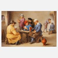 um 1900, nach David Teniers, signiert R. Krauss, Prägemarke, Modellnummer 310, feine polychrome Aufglasurbemalung, Szenerie Herren beim Trinken und Kartenspielen, in einer schwarzen Lackleiste gerahmt, Maße gesamt 23 x 29 cm.