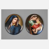 um 1900, ungemarkt, ausgemalte ovale Plaketten mit Darstellung Madonna della Sedia nach Raffael bzw. Mutter Gottes im blauen Umhang, normale Altersspuren, Maße je 4 x3,5 cm.