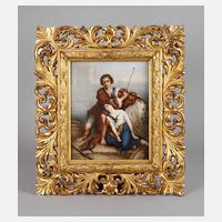 um 1900, ungemarkt, rechteckige flache Porzellanbildplatte mit polychromer Aufglasurbemalung, unsigniert, Zigeunerszene mit traurigem Musikantenpaar, in einer dekorativen 12 cm breiten Goldstuckleiste gerahmt, diese alt restauriert, mit kleiner Fehlstelle, Platte mit kleinem Brandfleck, sonst guter Zustand, Maße Platte 32,5 cm x 26,5 cm, gesamt H 52 cm x B 57 cm.