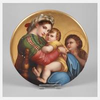 rechts unten signiert L. Scherf (Louis Scherf), unglasierter Boden mit Pressmarke, Jahresbuchstabe S für 1918, Prägenummer 655 und 525 sowie weiteres Prägezeichen, großformatige hochrechteckige Porzellanplatte mit außerordentlich feiner polychromer Malerei nach dem berühmten Gemälde der italienischen Renaissance von Raffael um 1512/13 (heute in der Gemäldegalerie Alte Meister Dresden), bühnenartige Darstellung der auf einer Wolke und zwischen einem geteilten Vorhang stehenden Madonna mit Kind, flankiert von Papst Sixtus II. und der Heiligen Barbara, umgeben von zahlreichen schemenhaften Engelsköpfen sowie zwei aufschauenden Putten zu ihren Füßen, im orig. Prunkrahmen im italienischen Renaissancestil mit vergoldeten und dunkel patinierten Partien, verso Herstelleretikett Kunstgewerbliche Werkstätten Josef Pfefferle (München 2 NW, Theresienstraße 47 ...) mit handschriftlicher Musternr. 65 und Registernr. 4078, Rahmen minimalst bestoßen, die ungewöhnlich großformatige Platte in sehr gutem Zustand, Maße Platte 65 x 47,5 cm, Rahmen gesamt 88 x 70 cm. Künstlerinfo Louis Scherf: dt. Porzellanmaler (1870-1955), Schüler von Albert Schünzel, gemeinsam mit seinem Bruder Albert Scherf (1876-1953) seit Ende des 19. Jh. in der Porzellanmanufaktur Lichte/Thüringen und für KPM Berlin tätig, seine qualitätvollen Arbeiten wurden auf versch. internationalen Ausstellungen prämiert, u.a. mit der Goldmedaille der Weltausstellung 1904 in St. Louis, mehr als 80 von ihm bemalte Porzellanbildplatten nach klassischen Vorbildern befinden sich in der Porzellansammlung des Palazzo Pitti in Florenz, Quelle: Internet.
