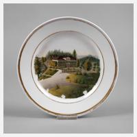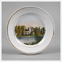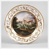 19. Jh., ungemarkt, geprägte Nummer 3, im Spiegel ausgemalter sommerlicher Blick auf das Schloss aus der Vogelperspektive, Goldstreifendekor, berieben, D 20 cm.