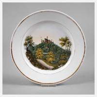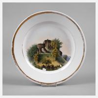 19. Jh., ungemarkt, geprägte Nummer 3, im Spiegel ausgemalte sommerliche Landschaft mit Blick auf die Ruine, Goldstreifendekor, berieben, D 20 cm.