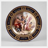 um 1900, gepinselte Bienenkorbmarke und S in Raute, in Rot bezeichnet, signiert Fritsch, feine polychrome Aufglasurbemalung, ornamentale Reliefgoldmalerei auf kobaltblauer Fahne, partiell weißgehöht, Darstellung der jungen Dame mit Kette und Haarband, Vergoldung etwas berieben, sonst guter Zustand, D 22,5 cm.