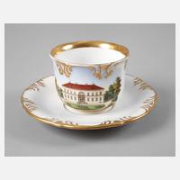 Mitte 19. Jh., ungemarkt, leicht gebauchte Tasse mit reliefierten Ornamenten am Lippenrand, Ohrenhenkel mit Daumenrast, schauseitig fein gemalte polychrome Gebäudeansicht eines herrschaftlichen Hauses, originale Untertasse, Lippenrand mit minimalsten Bereibungen, sonst guter Zustand, H 7,5 cm.
