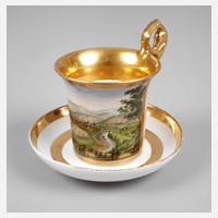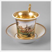 1. Hälfte 19. Jh., ungemarkt, schauseitig eine große polychrom gemalte Kartusche mit Blick auf die Stadt Saalfeld in sommerlicher Hügellandschaft, radierte Goldmalerei, rückseitig roséfarbener Fond, hochgezogener Volutenhenkel mit Blattabschlüssen, dazu Untertasse mit Goldmalerei, diese mit nicht durchgehender Bodenspinne, H 11 cm.
