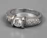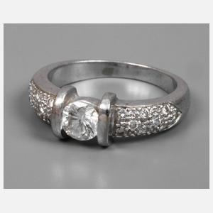 2. Hälfte 20. Jh., Weißgold geprüft 750/1000, besetzt mit einem großen Brillanten von ca. 0,25 ct in guter Qualität, Ringschiene seitlich mit kleinen Diamanten besetzt, RW 17 mm, G ca. 5,3 g.
