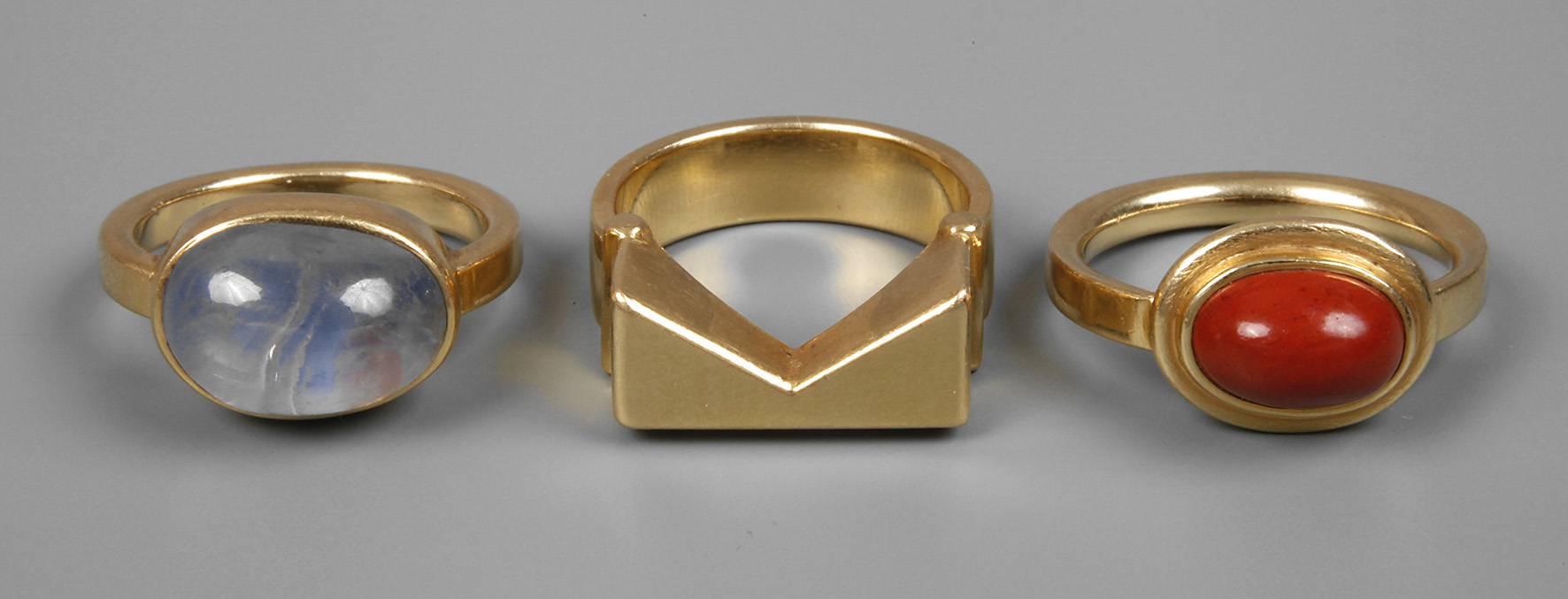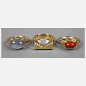 um 2000, Gelbgold gestempelt 750 und Marke JS, jeweils Unikate, 1. massive Schiene von 3 mm, besetzt mit rotem Jaspiscabochon in Zargenfassung, RW 17,5 mm, 2. schlichter Damenring, besetzt mit etwas ungleichmäßig geschliffenem Saphircabochon von 11 x 14 mm mit typischen Wachstumsmerkmalen, Zargenfassung, RW 17 mm, 3. Damenring mit ca. 6 mm breiter Ringschiene und geometrisch gestaltetem Ringkopf, RW 17 mm, jeweils Tragespuren, G gesamt ca. 22,8 g.