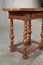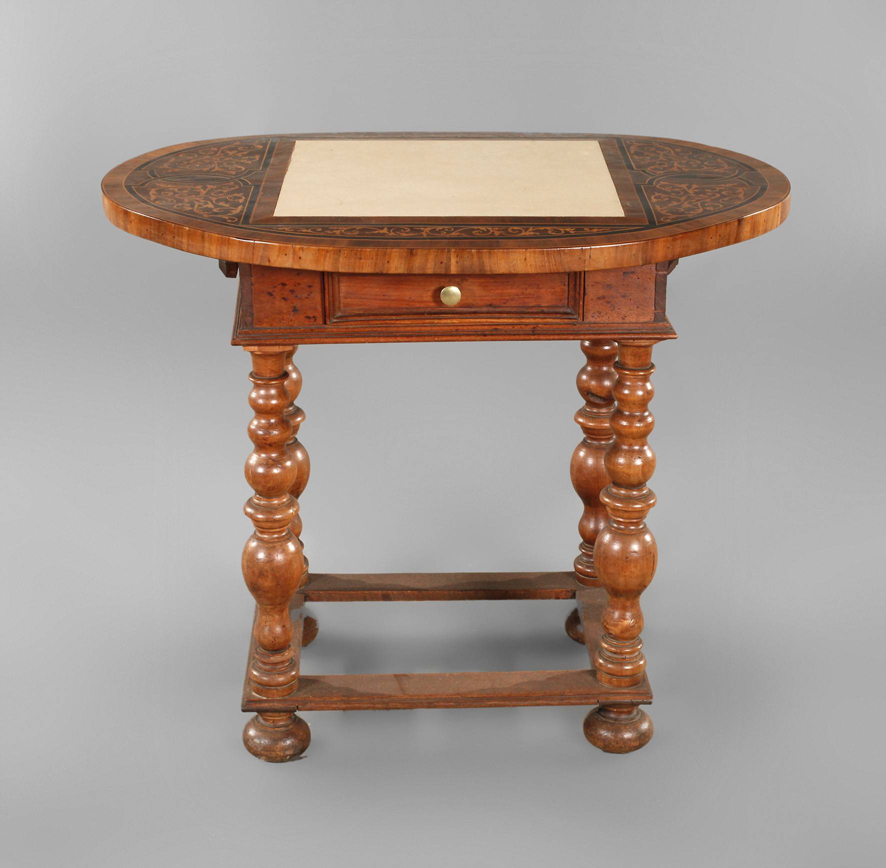 wohl Tirol, um 1650, ovale Platte in Nussbaum auf Nadelholz furniert, mit ornamentalen Einlegearbeiten in Ahorn, Mahagoni und Ebenholz, mittig quadratische Sollnhofer Marmorplatte, gedrechseltes Gestell aus massiver Buche, Zarge mit kleinem Schubkasten, vereinzelte Wurmlöcher, Oberfläche der Platte restauriert, sonst guter Originalzustand, Maße 74 x 88 x 64 cm.