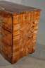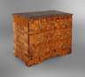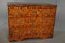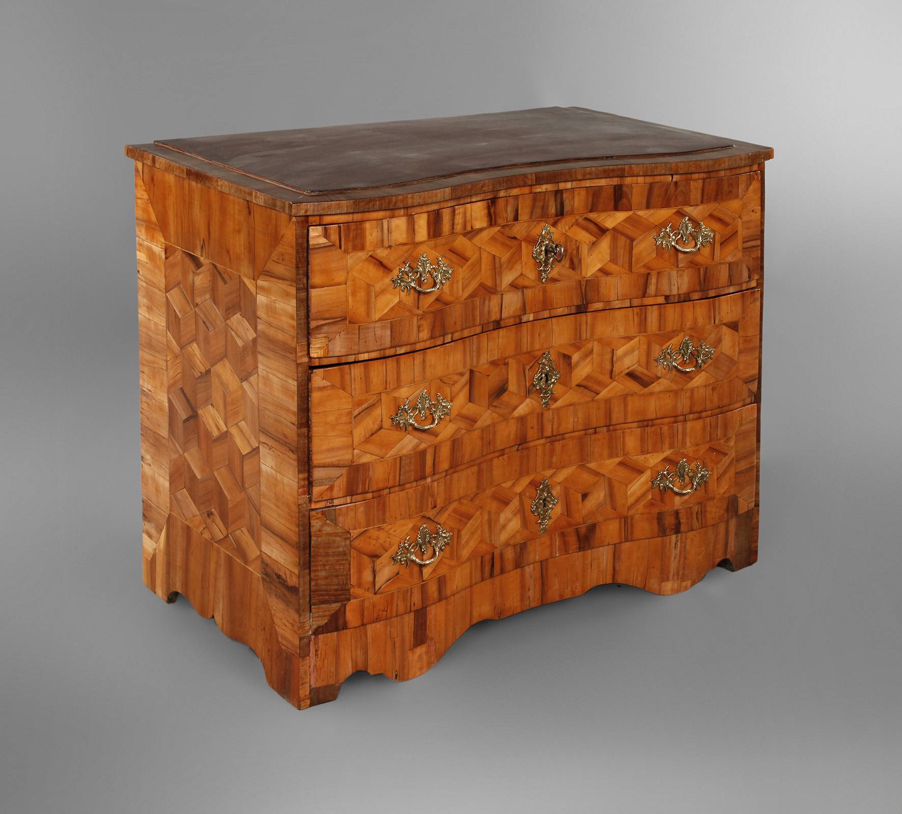 1. Hälfte 18. Jh., Nussbaum auf Nadelholz furniert, dreischübiger Korpus mit zweifach gebauchter Front, verziert mit Würfelmarketerie, originale Schlösser und Beschläge, die Schübe innen mit altem Marmorpapier ausgekleidet, restauriert, Platte aus Sperrholz ergänzt, Maße 85 x 111 x 60 cm.
