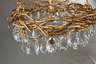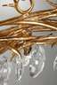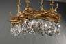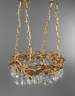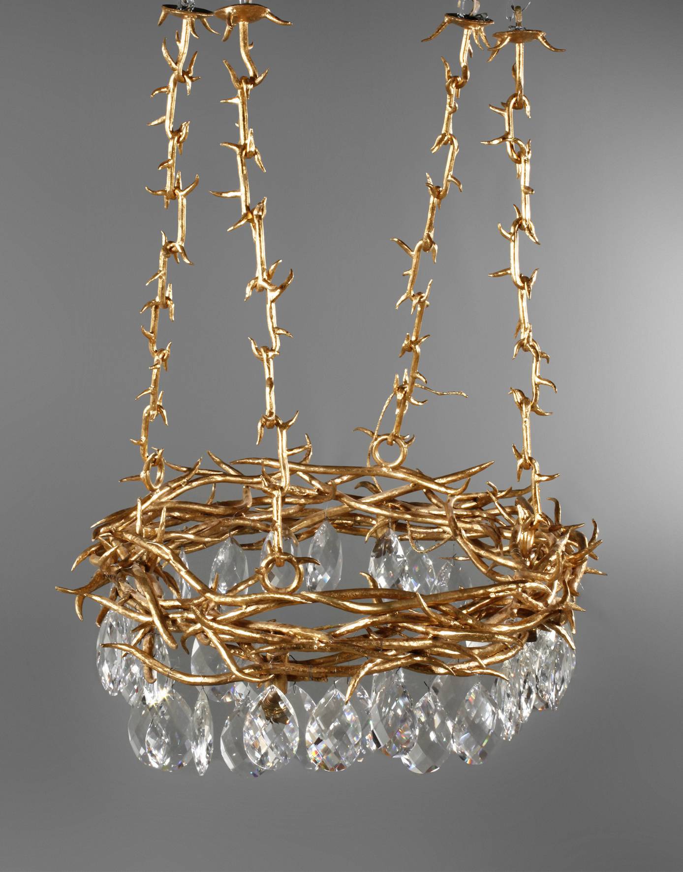 in der Art Hervé van der Straeten, wohl 1980er Jahre, Eisen geschmiedet und vergoldet, Kranz aus verwobenen Zweigen mit großen abgehängten Bleikristalltropfen, Abhängung durch vier Ketten, nicht elektrifiziert, H 95 cm, D 77 cm.