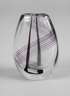 Schweden, 1980er Jahre, signiert, Modellnummer 441402, farbloses Glas, ausgekugelter Abriss, abgeflachte Form mit eingeschmolzenem violetten Fadendekor, stärkere Gebrauchsspuren und eine Kerbe am Stand, H 10 cm.