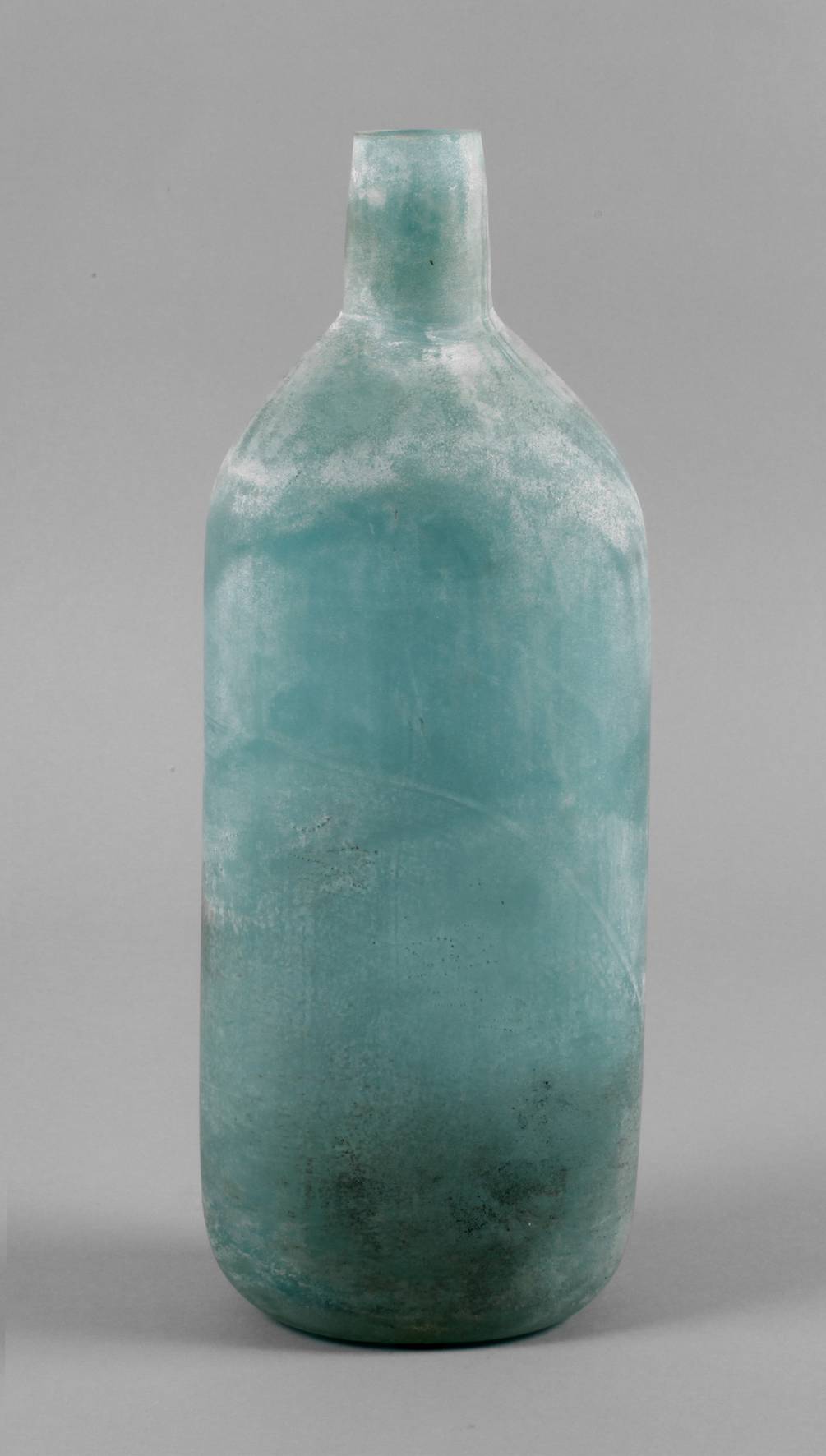 2. Hälfte 20. Jh., am Boden originale Klebeetiketten, Modellnummer 2074/111, signiert, farbloses Glas, türkisfarben unterfangen, die Oberfläche mit matten weißen und violetten Pulveraufschmelzungen, ovale Form mit rundem Hals, guter Zustand, H 42 cm.