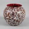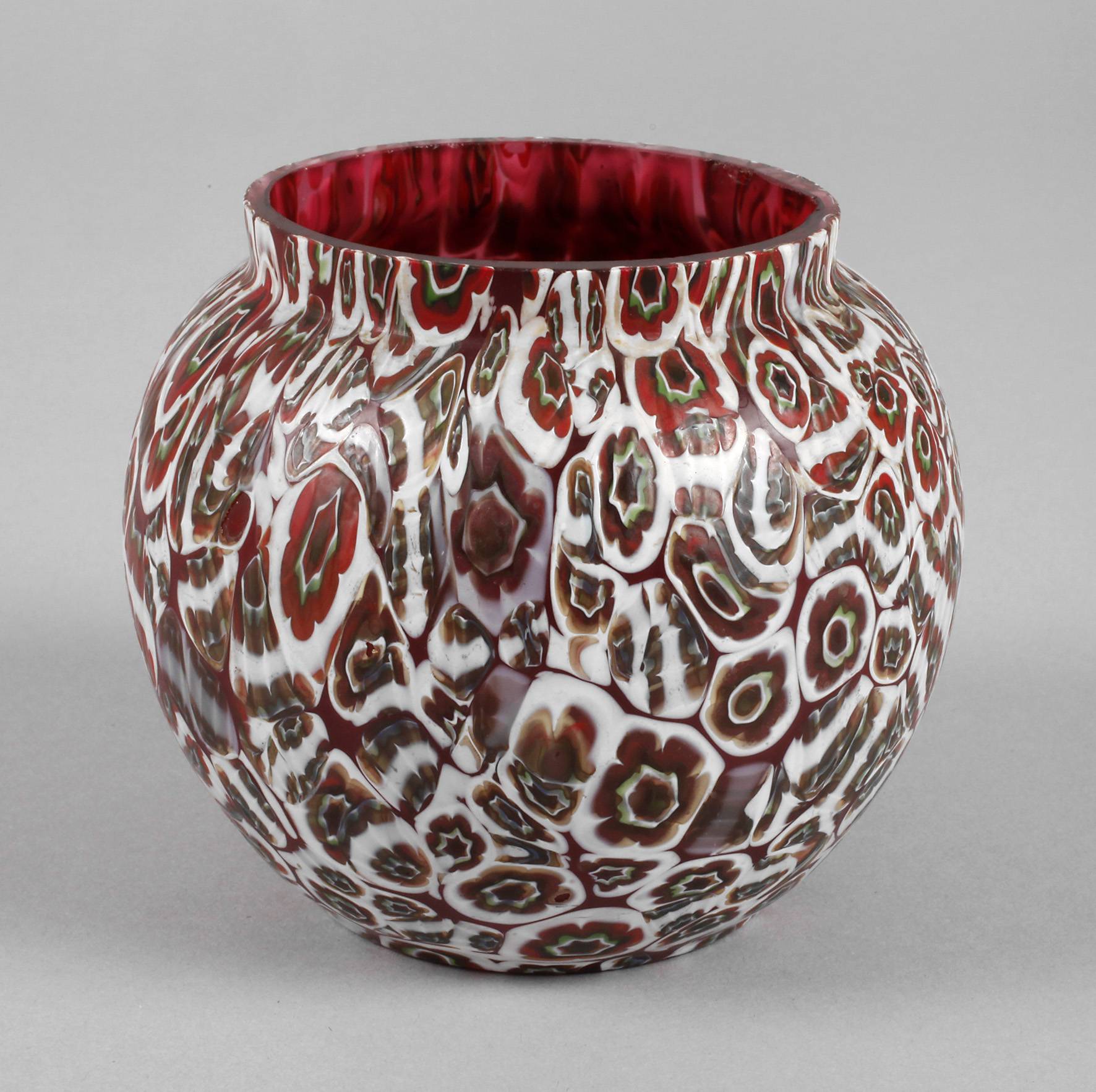 2. Hälfte 20. Jh., roséfarbenes Glas formgeblasen, aufgeschmolzene Murrinen in Rot, Grün und Weiß, Kugelform mit kurzer Mündung, guter Zustand, D 11 cm.