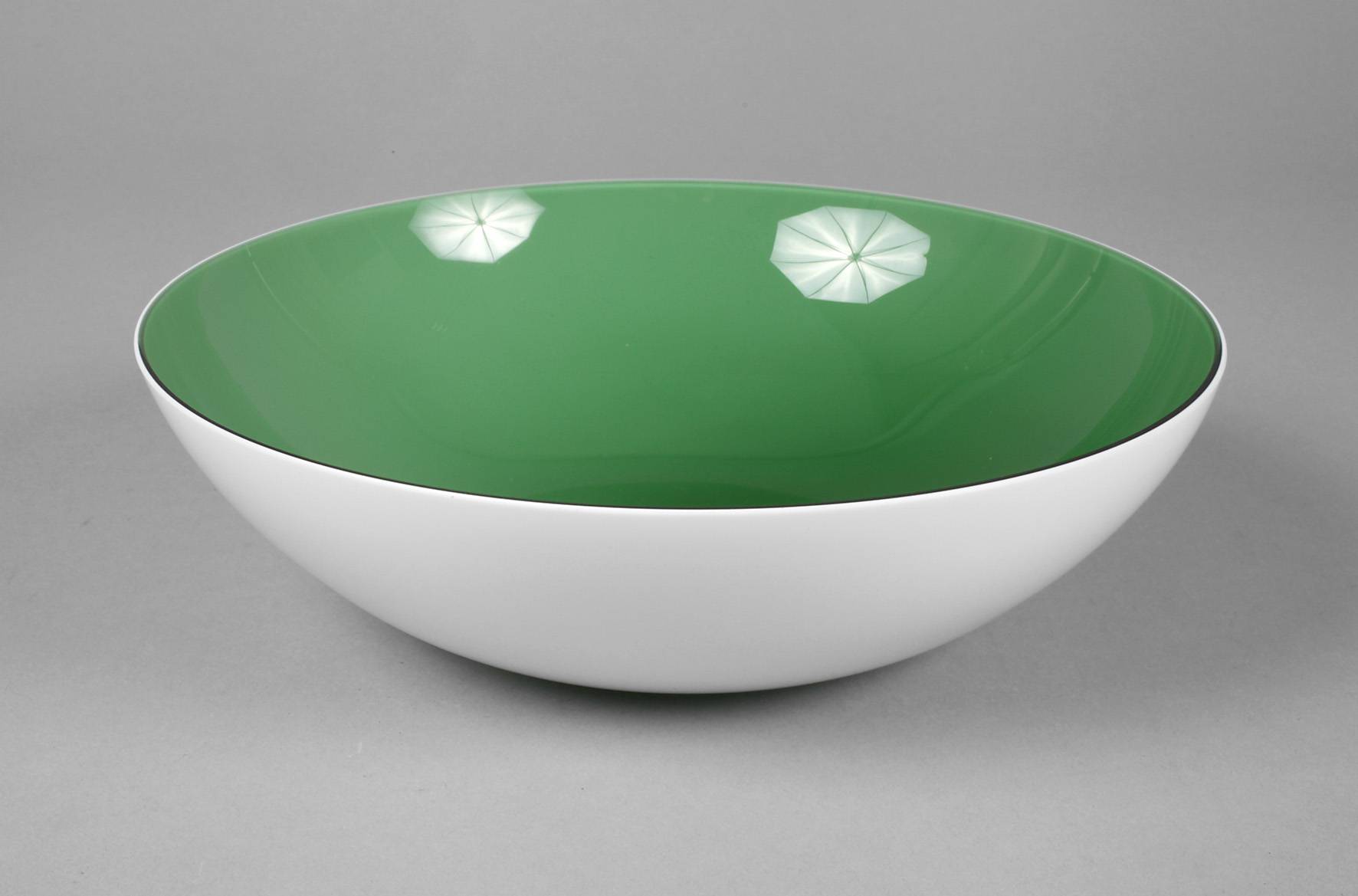 Entwurf 1954/55, Ausführung Nason & Moretti, farbloses Glas, grün und weiß unterfangen, runde Schale in schlichtem Design, geringe Gebrauchsspuren, D 24 cm.