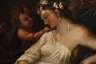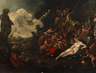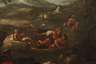 am Ufer eines Sees in sommerlicher, gebirgiger Landschaft lagernder Dionysos (Gott des Weines, der Freunde, des Rausches, der Trauben, der Fruchtbarkeit sowie des Wahnsinns und der Ekstase der auch wegen des Lärmens seiner Anhänger Bacchus [dt.: Rufer] genannt wurde) mit seinem Gefolge aus Satyrn, Putten, Silenen und Mänaden in spärlicher Bekleidung, sich dem Wein, der Musik, dem Bade und der Ekstase hingebend, minimal pastose Mythenmalerei, Öl auf Leinwand und Keilrahmen, unsigniert, Craquelure, partiell mehrfach doubliert, restauriert, am unteren Bildrand partiell Malschichtverlust, etwas restaurierungsbedürftig, ungerahmt, Maße ca. 80 x 107,5 cm.