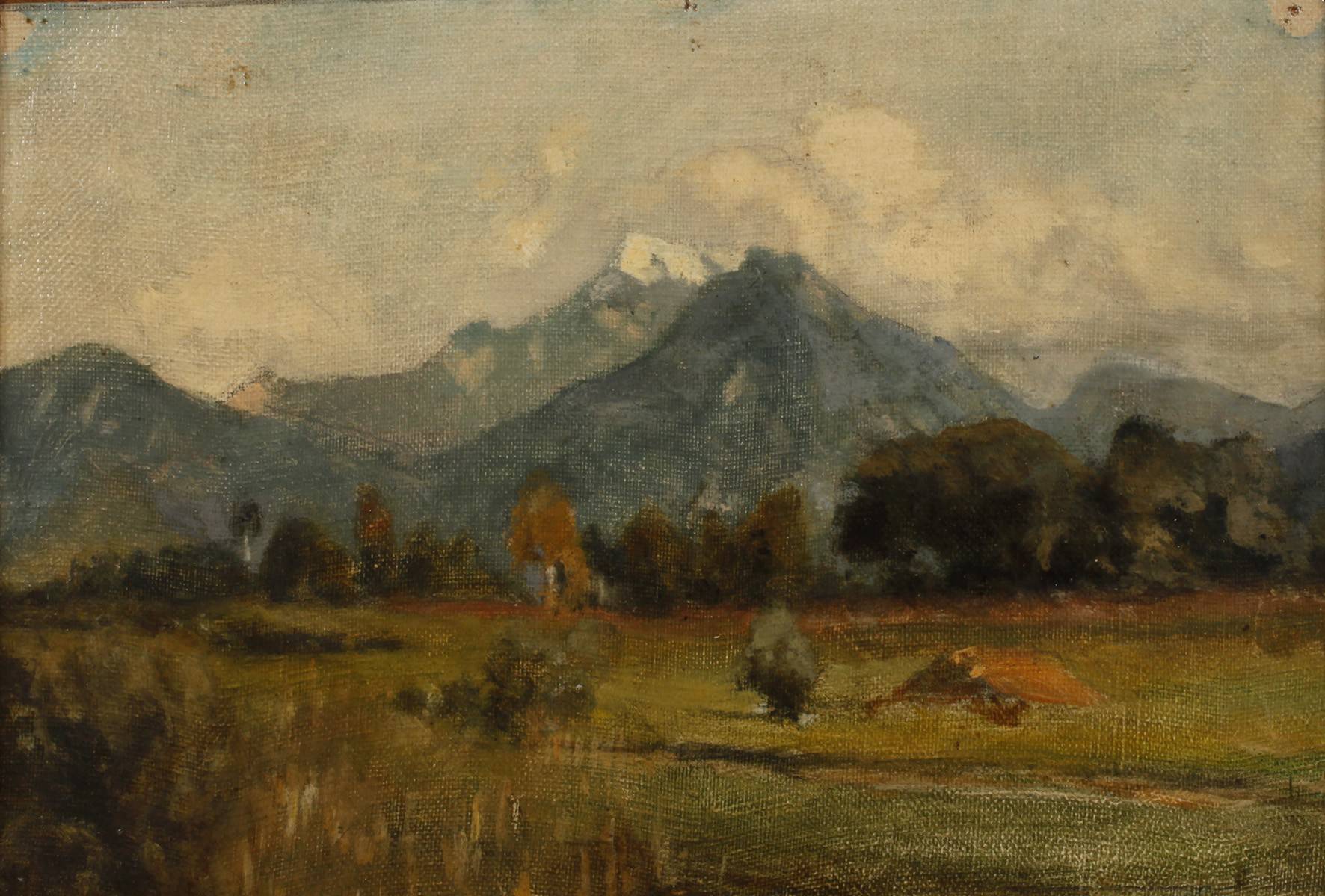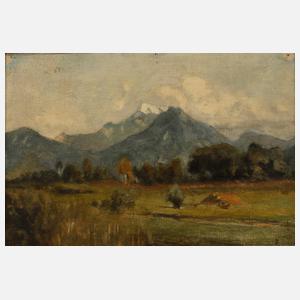 Blick von einer leichten Anhöhe über eine Wiese, mit vereinzeltem Buschwerk, vor der imposanten Kulisse der teils schneebedeckten Alpen, lasierende Malerei in gedeckten Tönen, Öl auf Leinwand, diese auf Hartfaserplatte kaschiert, um 1880, unsigniert, rückseitig auf Aufkleber bezeichnet „Carl Bolze *1832 Wien +1913 München Studium bei Wopfer in München“, minimal reinigungsbedürftig, gerahmt, Falzmaß ca. 18,5 x 26 cm. Künstlerinfo: dt. Landschaftsmaler, 1832 Wien bis 1913 München, bis 1871 als Kaufmann in Wien tätig, Schüler bei Joseph Wopfner und Julius Lange, 1902 auf der Ausstellung im Glaspalast vertreten, Quelle: Thieme-Becker, AKL und Bötticher.
