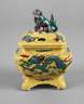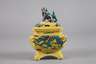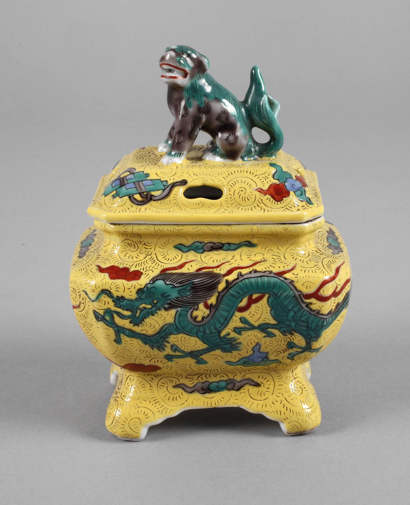 Anfang 20. Jh., ungemarkt, Porzellan auffällig in kräftigen Emailfarben bemalt, umlaufendes Drachenmotiv mit geprägten Spiralornamenten, der durchbrochen gearbeitete Deckel mit figürlichem Knauf in Form eines Foh-Hundes, H 15 cm.