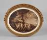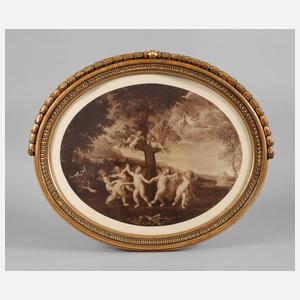 um 1910, vergoldet, gestucktes Akanthusblattrelief und Bekrönung mit Lorbeerfries, verglast, rückseitig verschlossen, altersgemäß gute Erhaltung, Falzmaß ca. H 43 x B 53 cm, Gesamtmaß H 53 x B 64 cm.