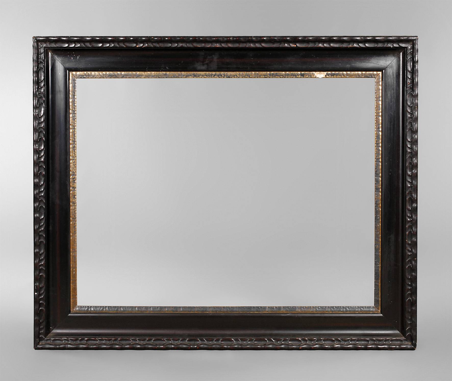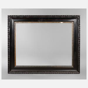 Rahmen aus ca. 13 cm breiter, steigend profilierter, ornamental gestuckter und schwarz-braun gelackter Holzleiste mit vergoldetem Inlay, Gehrungen geschnitten, Erhaltungsmängel, Falzmaße ca. 76,5 x 99,5 cm.