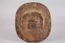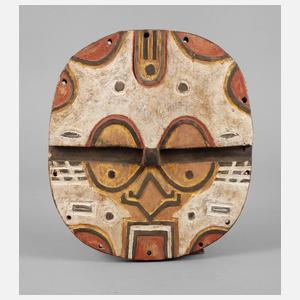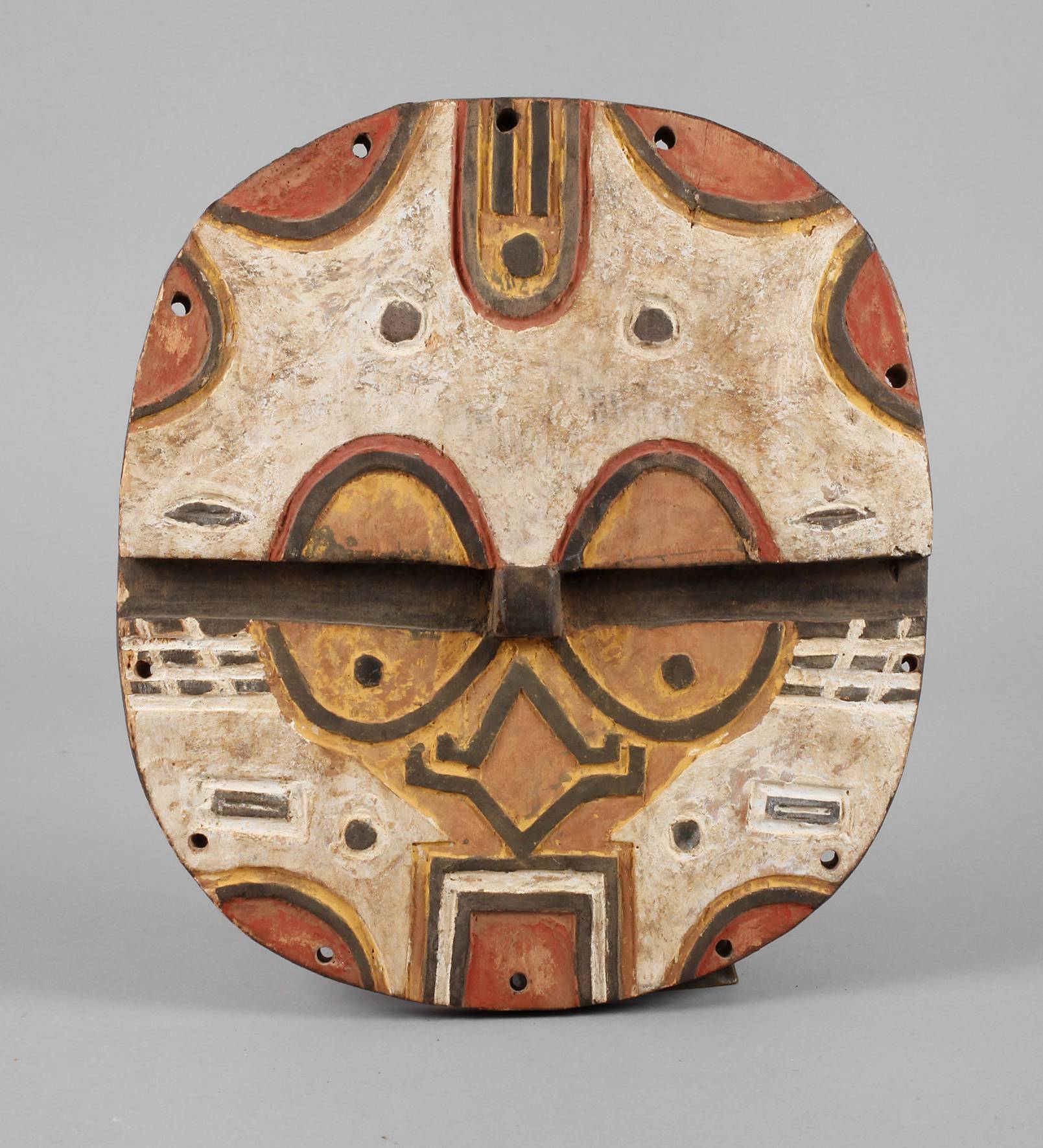 Kongo, 1960er Jahre, Holz beschnitzt und farbig gefasst in Weiß, Braun, Rot und Ocker, flach reliefiert, die erhobenen Teile farbig betont, rückseitiges Tragestück fehlt, H 31,5 cm, B 28 cm.
