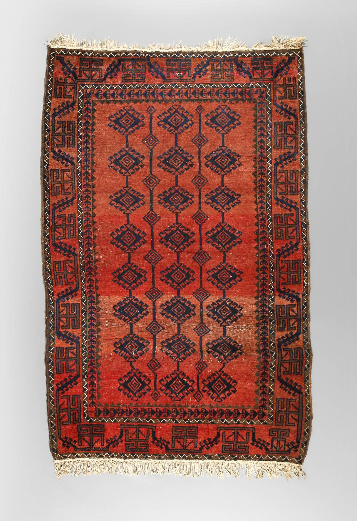1. Hälfte 20. Jh., klassisches geometrisches Dekor im Rapport über rostrotem Fond, luftig verzierter Bordürenbereich, partieller ausgedünnter Flor, Abrash, Maße 127 x 186 cm.
