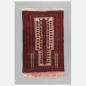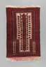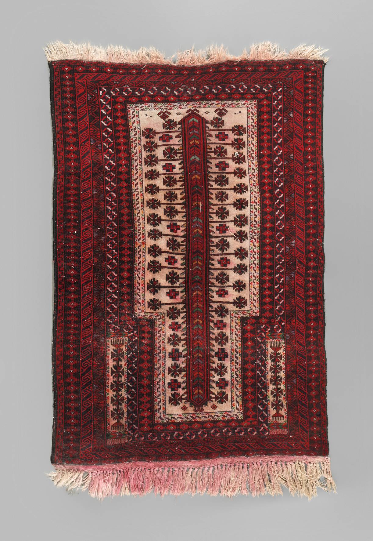 Mitte 20. Jh., klares geometrisches Dessin über rostrotem Grund, partiell verfärbt, Altersspuren, Maße 135 x 96 cm.