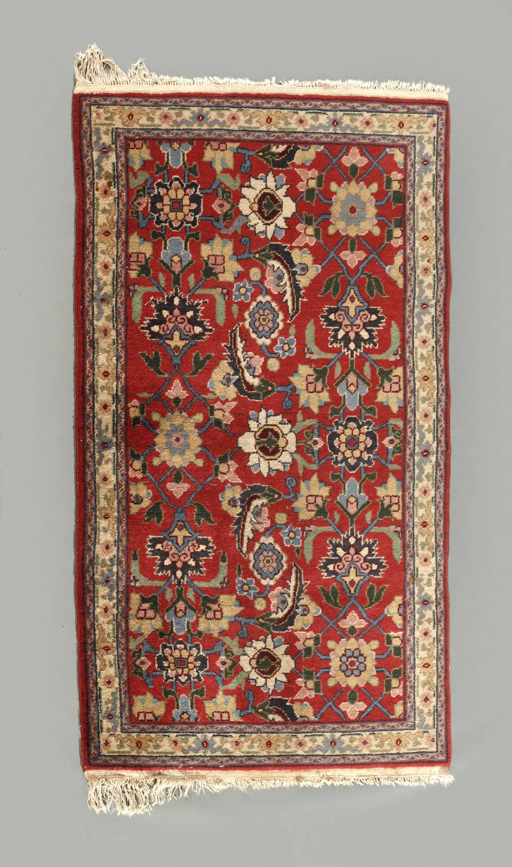 Mitte 20. Jh., luftiger, großformatiger Floraldekor über rostrotem Fond, schmale umlaufende Bordüre, Fransenbesatz teils eingekürzt, leichte Altersspuren, Maße 165 x 99 cm.