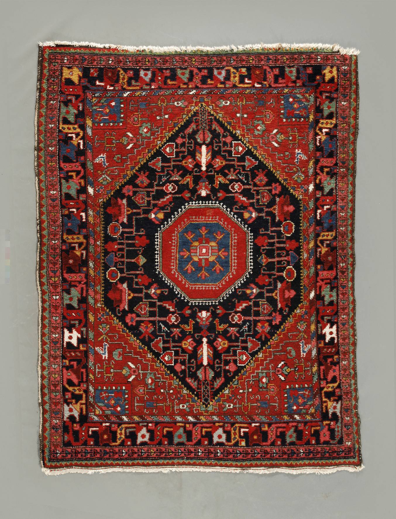1. Hälfte 20. Jh., polygonal gestaltetes Mittelmedaillon mit stilisierten Tier- und Floralmotiven, gerahmt von korrespondierendem Dekor und mehrteiliger Randbordüre, eine Schmalseite verkürzt, Maße 149 x 109 cm.