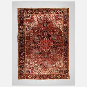 1. Hälfte 20. Jh., rautenförmig verziertes Mittelfeld mit äußerst kleinteiligem Dekor, breite umlaufende Bordüre, Fransenbesatz gekürzt, Ablauf- und stärkere Altersspuren, reinigungsbedürftig, Maße 343 x 270 cm.