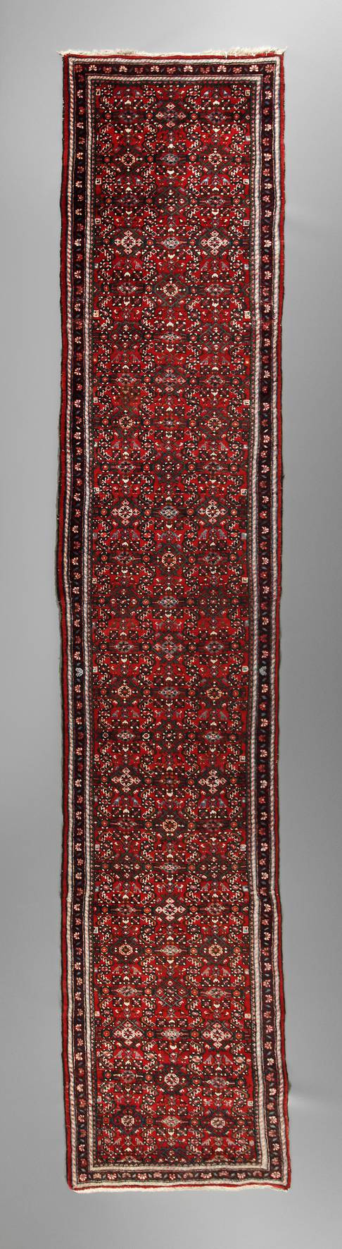 Mitte 20. Jh., rapportierender Floraldekor über rostrotem Fond, schmale Bordüre, guter Zustand mit leichten Altersspuren, Maße 418 x 82 cm.