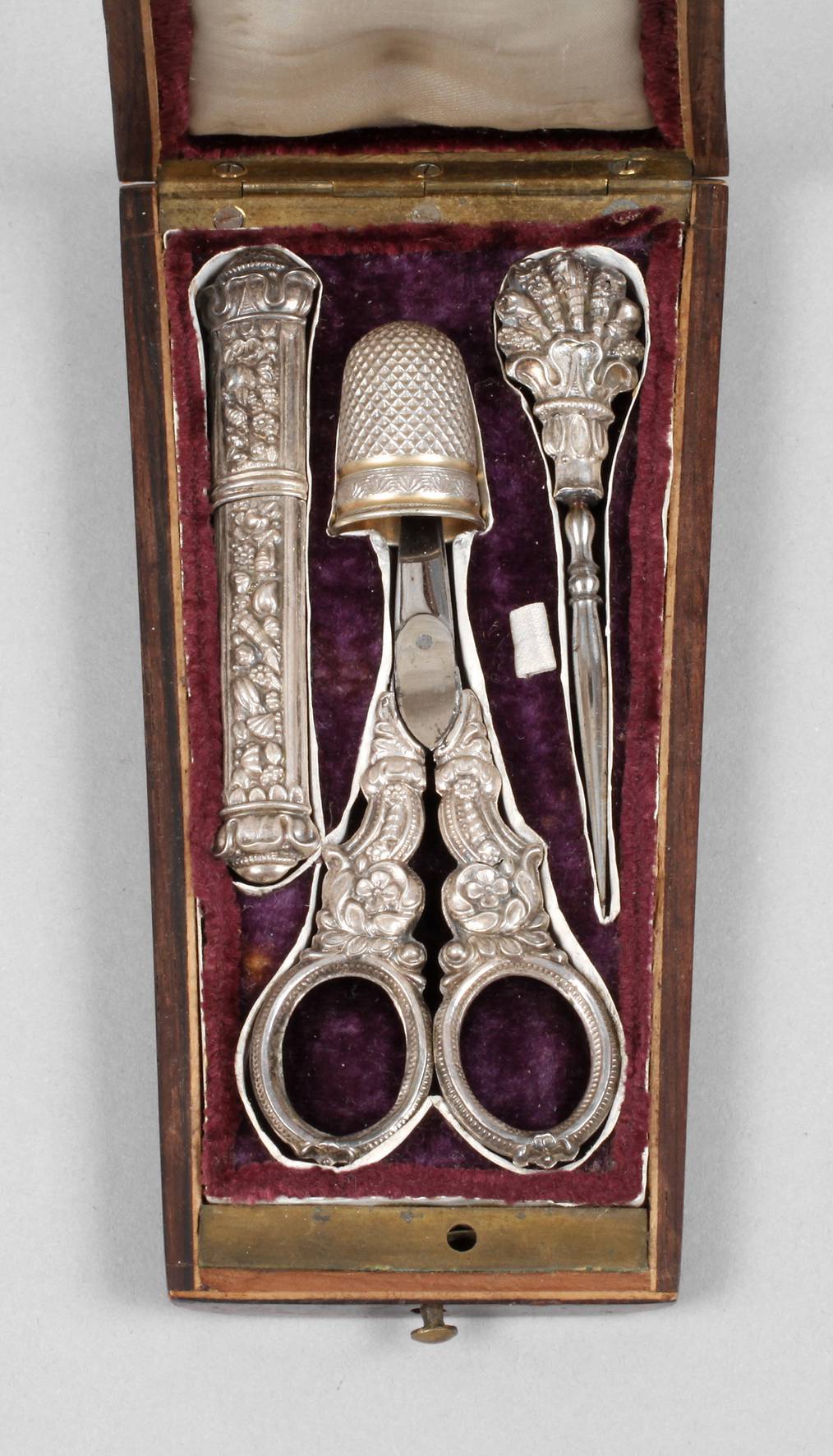 19. Jh., Palisander mit intarsiertem Floralmotiv, Messingmontierungen, Innenleben mit purpurnem Samt ausgekleidet, Utensilien aus geprägtem Silberblech mit reliefierten floralen Motiven, dabei Nadelbehälter, Ahle, kleiner Schere und Fingerhut, Alters- und Gebrauchsspuren, L Etui 13 cm.